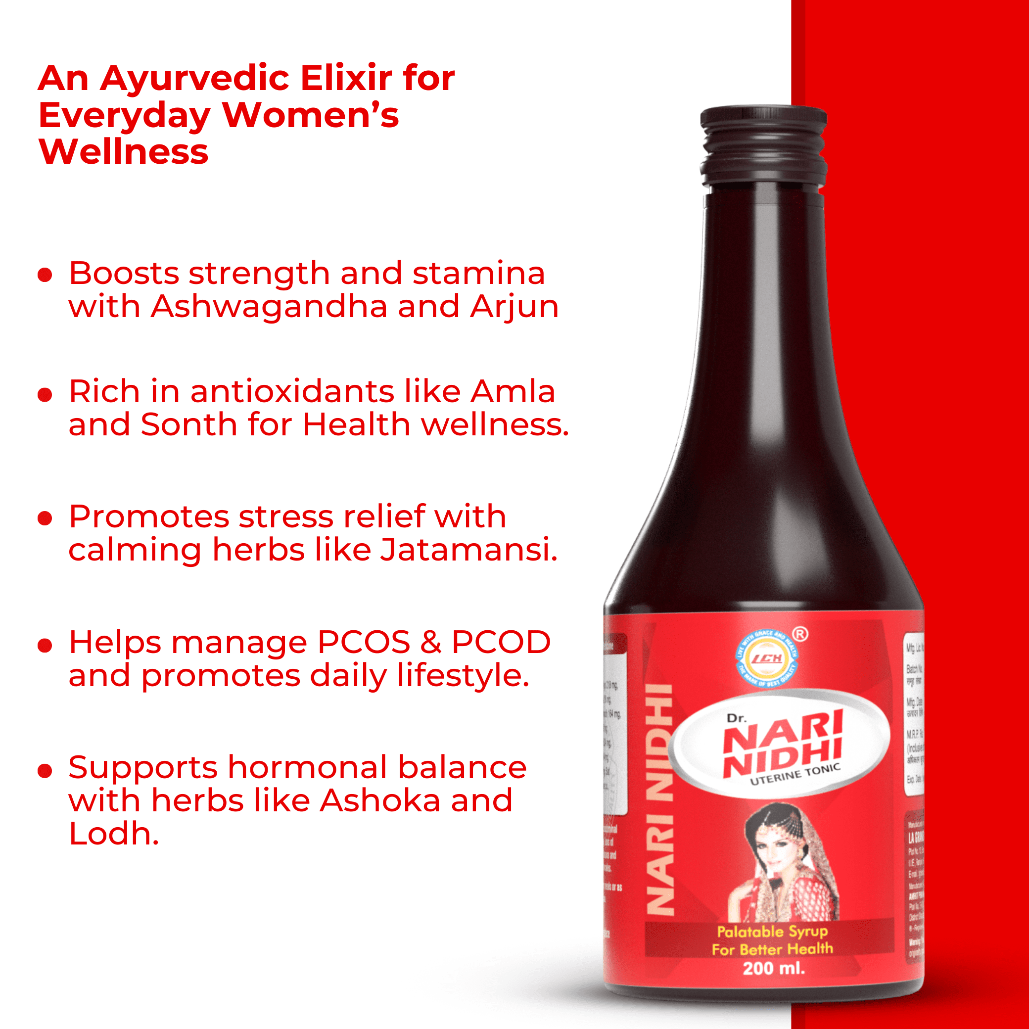 LGH Nari Nidhi Syrup is a gentle Ayurvedic tonic crafted to support women’s wellness through every phase of life. Made with a rich blend of 16+ herbs like Ashoka, Lodh, Shatavari, and Amla, it helps promote hormonal balance, ease fatigue, and support overall vitality. A daily dose of care for the rhythm of a woman’s body—naturally, gracefully, and effectively.